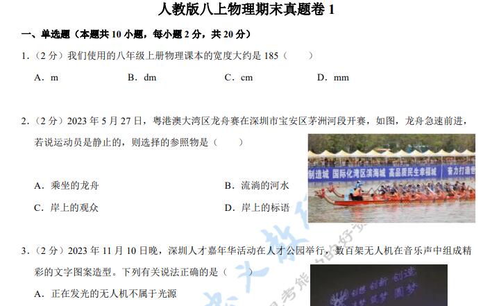 2025秋人教版《八上物理期末真题》3套PDF电子版下载