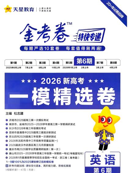 2026英语金考卷特快专递第6期《一模精选卷》是天星教育推出的高考英语教辅系列,按复习节奏分多期出版,每期收录最新优质模拟卷及高考真题。其特点在于紧贴考纲、命题鲜活,如英语阅读选材偏重科技与青年议题,选项干扰项设置贴近高考现场。该系列还注重解析透彻,每道题旁标注命题意图,帮助学生理解考点,提升应试能力,是新高考命题趋势的重要参考。