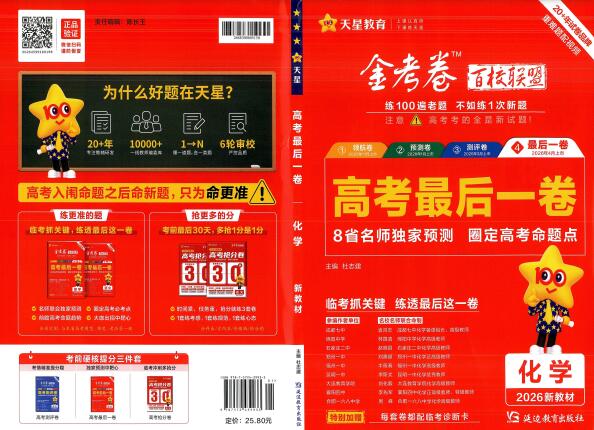 天星教育金考卷百校联盟系列压轴冲刺卷,2026高考临考终极预测。由全国 8 省名校特高级教师联合命制,100%原创试题,深度贴合新高考命题规律与题型结构,精准圈定高频考点与命题热点。试卷严格对标真题格式,附标准答题卡与详细评分标准,重难题配名师视频解析。主打考前 30 天全真模拟、查漏补缺、规范答题、稳定心态,题量精、预测准、解析透,是高三考生考前冲刺、实战演练、抢分提分的口碑押题卷。