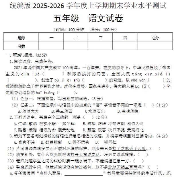 (2)任务二:下面选项中与语段中的加点的“落”字读音不同的一项是( )(1分)