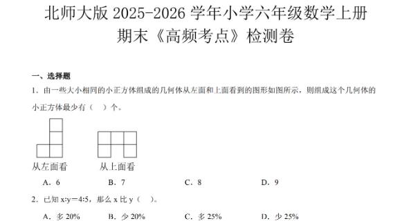 1.由一些大小相同的小正方体组成的几何体从左面和上面看到的图形如图所示,则组成这个几何体的小正方体最少有( )个。