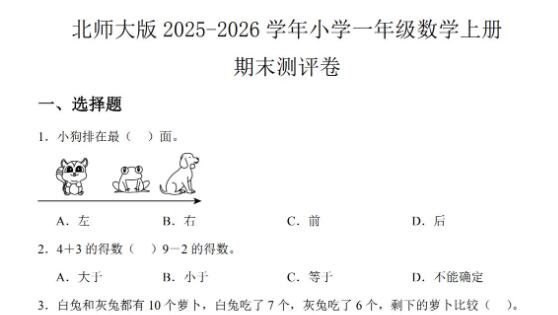 北师大版2025-2026一年级数学上册期末测评卷(附答案)