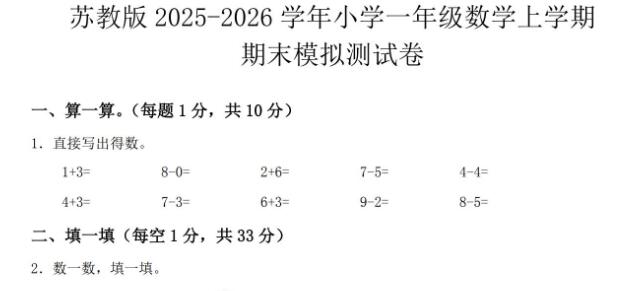 苏教版2025-2026一年级数学上学期期末模拟测试卷(附答案)