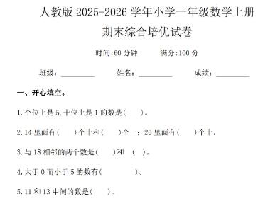 • 人教版2025-2026一年级数学上册期末测试卷(附
