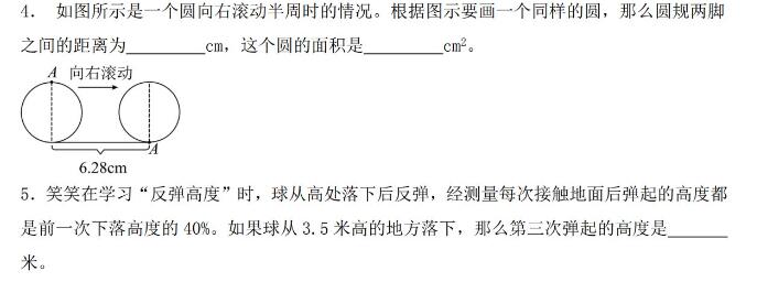 4. 如图所示是一个圆向右滚动半周时的情况。根据图示要画一个同样的圆,那么圆规两脚之间的距离为_____cm,这个圆的面积是_____cm2。