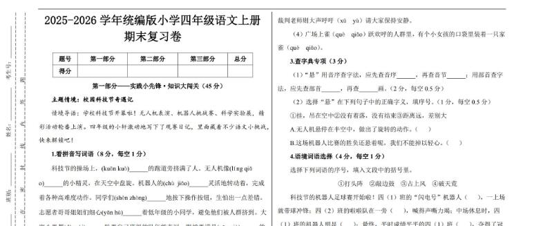 情境导语:学校科技节开幕啦!无人机表演、机器人挑战赛、科学实验展,精彩活动轮番上演。四年级的小轩激动地写下了观赛日记,里面藏着不少语文小挑战,快来解锁吧!