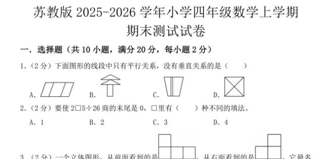 苏教版2025-2026四年级数学上学期期末测试卷(含答案及解析)